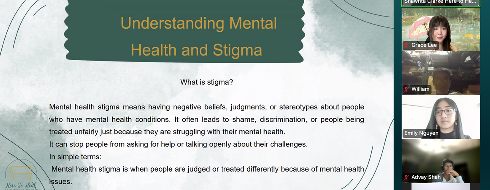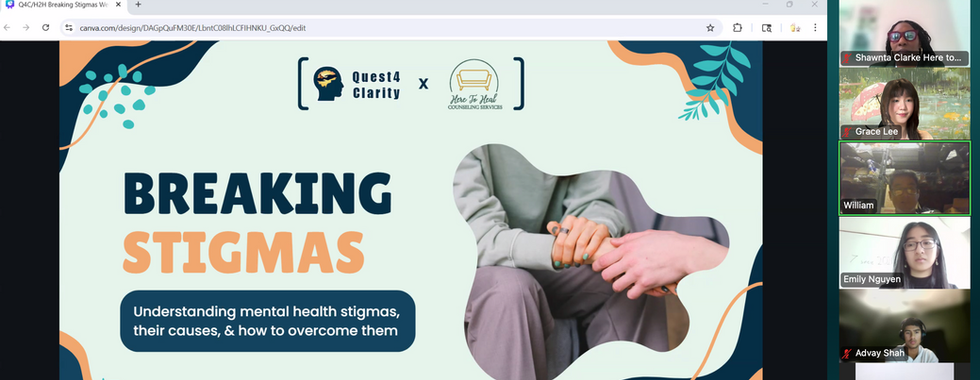 Warmly, thank you to everyone who joined us in the Quest4Clarity breaking mental health stigma webinar! We are grateful to have Shawnta Clarke, the founder of Here to Heal Counselling Services, who guided us through an informative presentation with statistics, background, and actions regarding stigmatization, led a virtual brainstorming "what would you do in this situation" game, and offered a safe and respectful space for asking questions and engaging in discussions.